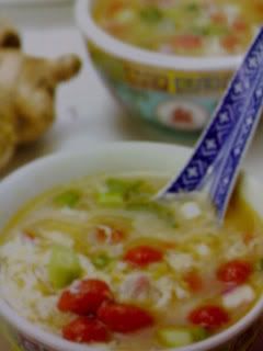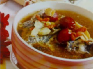 做法:1)烧热麻油 ,爆香姜茸后加入鸡汤煮沸 ,然后加入枸杞和盐