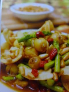 材料:干百合50克 ,松子30克 ,青芦笋(切段)30克 ,莲子(蒸熟,去芯)50克