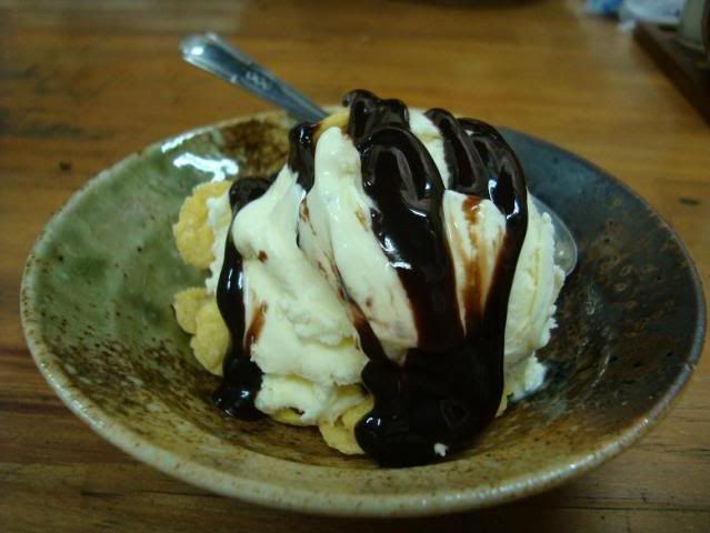 上面的食物,,可能是被你说的价钱吓倒,,所以 就觉得vanilla ice cream with corn flakes and chocolate saue