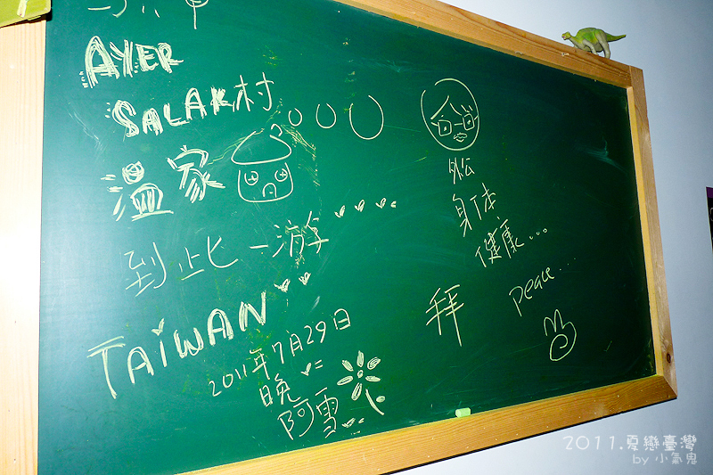 小姐们睡的白海豚四人房: 笨蛋鬼和小气鬼睡的蓝小企: 还有一间彩马团四人房,小气鬼竟然没拍到照,所以从他家的网站转载照片: 夜宿馆的外观: 馆外: 白天的巷子: 小姐们在夜宿馆留下的笔迹: