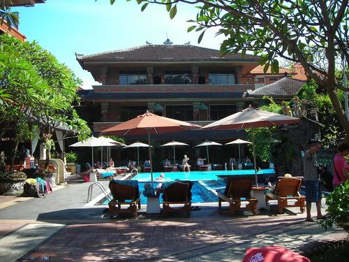 在 Bali的最後一晚﹐我選擇了這間靠海的酒店。原本我是訂了 Superior Room, 一間以現代化裝修的房間﹐由于我們 Check-in時已經是晚上 1.00am了﹐所以他把房間全出租了﹐而為我們upgrade 去 Deluxe Room. 原本心裡還暗暗高興﹐以為他會給我們公主床的房間﹐一進房﹐真的傻眼了。居然是 Balinese Style 裝修的房間。感覺就像進了20年前裝修的房間。而且還給了兩個單人床。。我的天呀!! 太晚而且也累了。。我們也懶得去吵。沖涼就睡覺了。
