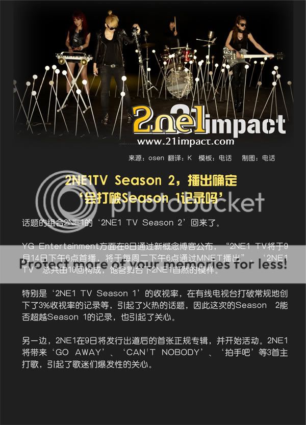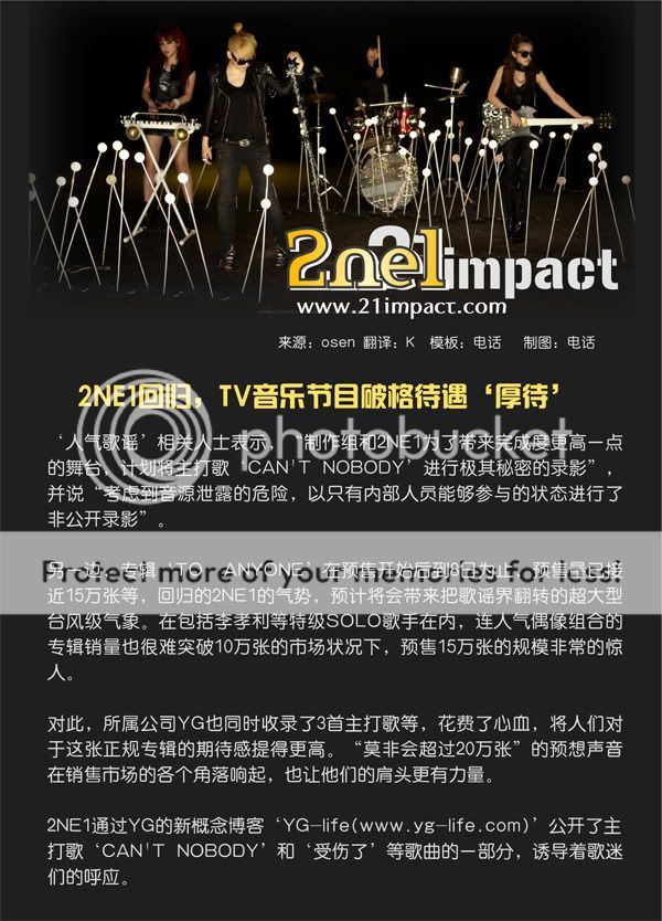 2NE1 has decided on three title songs ‘Can’t Nobody’, ‘Go Away’, and ‘Clap your hands’, displaying strong will power for their album activities this time. 2NE1 will be starting their regular activities for their first full length album with their comeback performance on SBS ‘Inkigayo’ on the 12th.