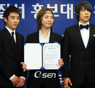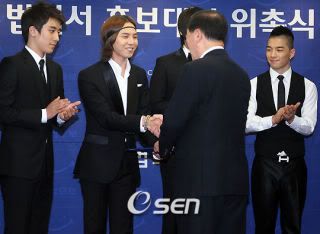 Idol group Big Bang members GDragon, TaeYang, TOP and SeungRi were at Seoul Education Cultural Centre on 18th May. They were assigned as the public information ambassadors for Korea’s Ministry of Jutice law order.