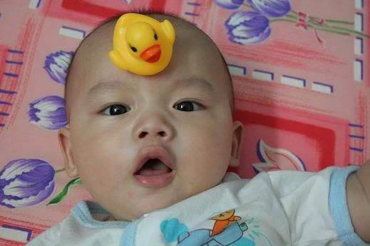 那天跟文杰闹着玩,拿了这小鸭子放上黏纸然后黏在文杰头上,