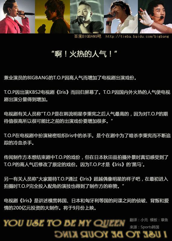 This isn’t the first time the two Big Bang members have been on screen. T.O.P., the oldest in the band, debuted in the 2007 KBS-TV drama "I Am Sam" and is currently shooting KBS-TV’s "Iris". Seungri, the youngest in the group, was the main character in the musical "Sonagi" last year. He also appeared in "Why Did You Come To My House", a movie starring Kang Hye-jung released last month.