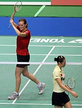 英格兰的克拉克/克洛格组合是本次比赛的5号种子,具备很强的实力,但是面对头号种子高崚/郑波,他们还是略逊一筹。首局比赛高崚/郑波上来就以6-2领先,对手追到5-7之后,高崚/郑波开始发力,连得7分后以14-5领先,此后的比赛进程平稳,21-12,头号种子赢得首局。第二局比赛一开始英格兰组合打得不错,他们曾经以4-0领先,但是高崚/郑波马上用一个8-0的高潮把比分反超为4-8,此后高崚/郑波一度把比分拉开到15-9。不过英格兰组合也没有放弃,他们最小时曾把分差缩小为1分,以15-16落后,但是关键时刻高崚/郑波没有手软,有惊无险的以21-17拿下第二局之后,顺利挺进四强。