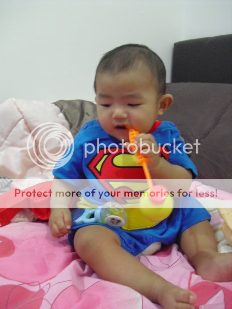 那天带红豆冰参加最上镜宝宝竞赛,怕输的洪大娘给红豆冰穿上了这套超人衣服,在广场走了一圈吸引了很多人的目光,一直逗红豆冰玩呢!还听到几个小孩说:“妈妈,我看到了superman baby哦!”