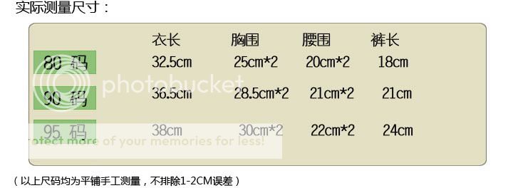 XL: (3-4岁)衣长 38CM ; 胸围 30cm * 2 短裤档长23CM,臀围35CM*2 身高100CM左右