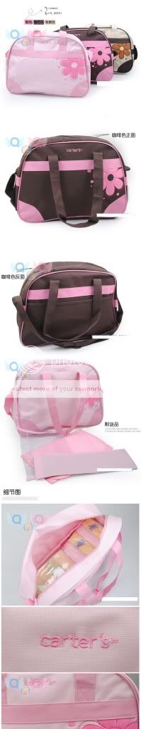 【面料】客供尼龙 300D牛津布 【颜色】卡其 粉红 咖啡 3种颜色 【尺寸】包37*13*28CM (长*高*深) 置物袋24*18CM(长*宽) 防湿尿垫53*29(长*宽) 【使用方法】手提,跨肩,超级方便 【配件】包内有防湿尿垫1个,透明置物袋1个(送隔尿垫) 小(5格) 小(5格)