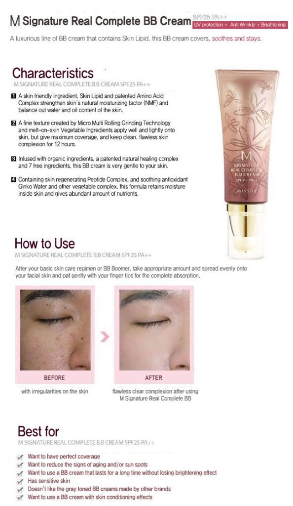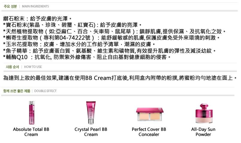 此款BB霜适合于干性肤质使用,有添wrinkle improvement等保养成份,且这款的修颜遮盖效果颇佳,受到不少韩国女性的追捧.使用后10-15分钟,自动贴合肤色,自然覆盖皮肤不规则缺点,一整天保持皮肤干净,完全没有油腻感,功效最全面的一款BB哦 ,含有珍珠粉和黄金粉,珍珠粉会有美白滋润皮肤的功效,黄金粉会给皮肤提供一层保护膜,阻挡辐射和有害气体对皮肤的侵害,适合各种肤质,遮暇效果和保湿效果都不错!此款的防晒功效很全,356日都适用.