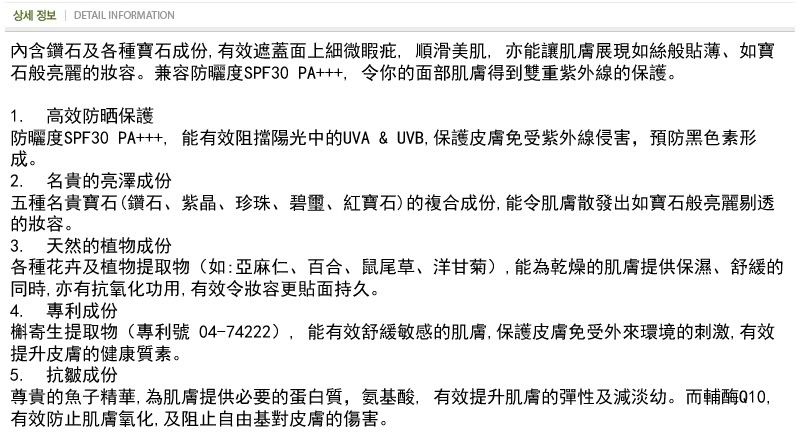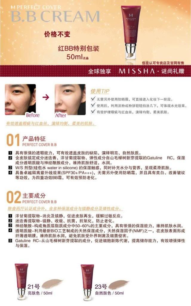 特别说明:这款BB霜取得韩国政府发给的“美白产品认证”、“有效遮挡紫外线认证”双重机能性认证。更优越的遮瑕度,有效遮盖面上的痘痘和因皮肤敏感而泛红的肌肤。