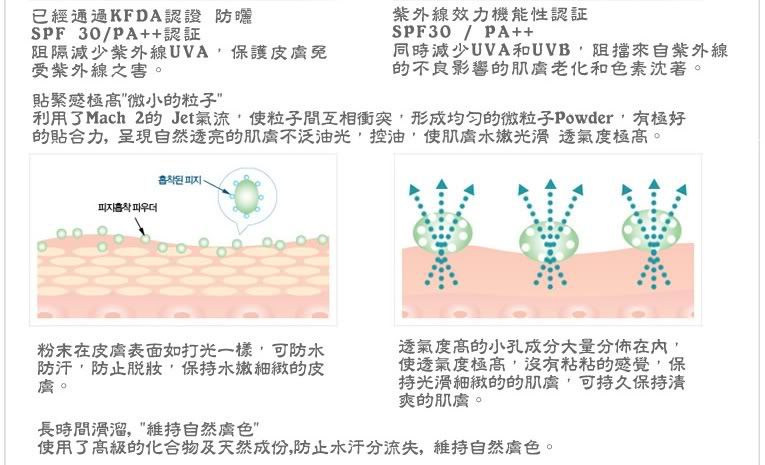1. 取得韩国政府发给的 ‘改善皱纹产品认证’、 ‘美白产品认证’、 ‘有效遮挡紫外线认证’ 三重机能性认证.