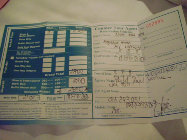 我们的 Receipt。先付 150baht 的 Transfer Fee,其余的就直接在 Fantasea 那里买票。单据上有写名价钱和载送时间。 |