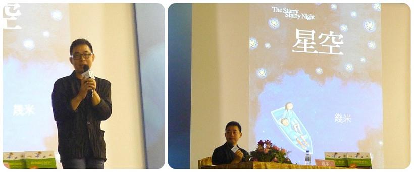 安静的坐在位上等候几米的出现。待司仪上场解说一番时,我四处张望想要寻找几米的身影。还未等到司仪宣布几米的到来时,只见一名身穿黑衣深色牛仔裤,个子中等戴副黑框眼镜的男子已自个儿走上了台上,台下随后传来了一阵热烈的欢呼声和掌声。那就是我们大家期待已久的几米,只见他有些不自在的左盼右顾的,当司仪将迈克风递给他时,他以颤抖的声音想要说些什么,却又支支吾吾的说不出话来。他情绪有些激动的,以极不稳定的声音缓缓道出他没想到在这里会有那么多他的书迷来捧场,让他好感动心情好激昂的。书迷想要再报以热烈的掌声时,他手足无措的叫大家别再拍掌了,他应该是怕大家的热情会让他更因此而说不出话吧!看着这样的几米,我心里有些惊讶亦有些感动,他的真情流露是我所不知道的另一面。眼前的几米好真实且真诚的努力在表达着自己的想法,我喜欢画着的几米,亦喜欢说着话的几米。