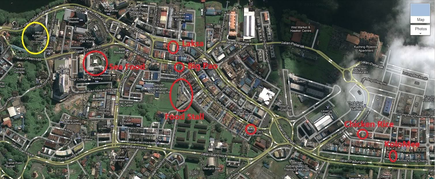 问那边Hotel 的人,很近,走过去,那边你能够看到大大的龙虾,大鱼,大螃蟹.....,很多美食,你去过一定会再去。你可以上网,打 kuching top spot food court.去查。 |