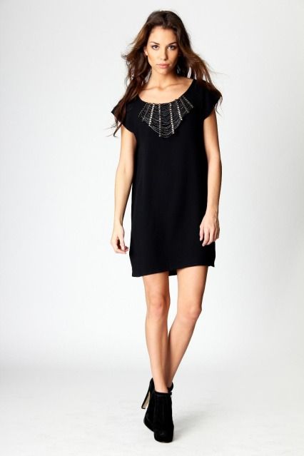 This season wear an LBD with a tough bit of style impact by slipping on this statement shift dress. With a feature stud and chain neckline, there is no need to worry about accessories!