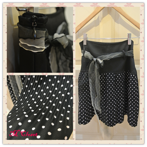 圆点黑色气质百褶裙 – 附黑白雪纺缎带(商品编号:S04)