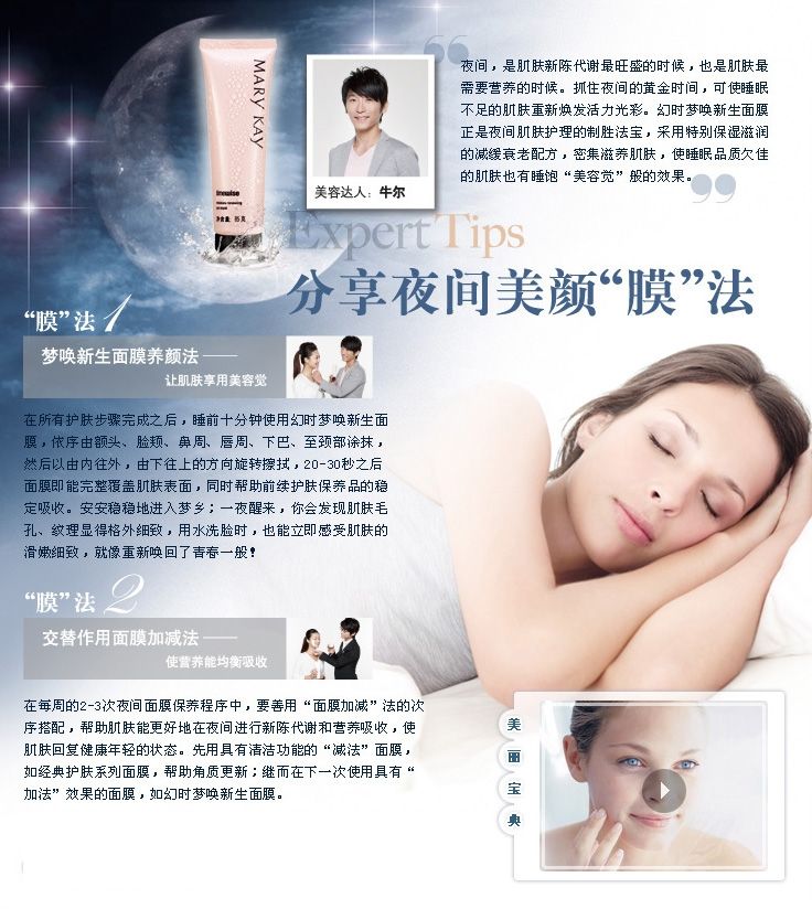 晚上睡觉的时候,妳的肌肤正处于休息的黄金时刻, 格外需要特別的滋养、呵护,以及补充水分。 只需在睡前薄薄地敷抹在臉上, 早上起來,妳会发现肌肤更水嫩、滑嫩、光泽;持续使用, 帮妳把弹性、紧实与青春光采都找回來了!