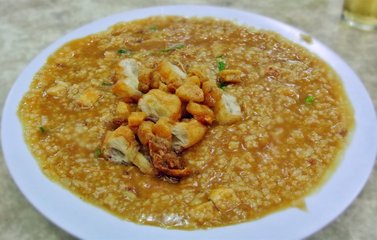 炒粥一上桌时那卖相其实不怎么吸引人,一大碗黑黑糊糊的粥看起来好像是加了很多酱油的白粥。一口吃下时,咦!其实味道不简单哦!!我尝到很香的鱿鱼丝味道,加上粉粉地芋头粒和脆脆地猪油渣, 油条和得当的调味,让人一口接一口,赞啦!!