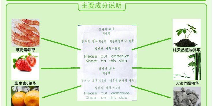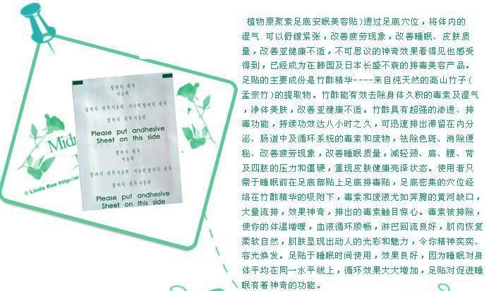 "足贴"排毒吸酯美容贴的主要成份竹酢液精华是用高山孟宗竹经由1000℃以上高温经干馏取得,内含有两百种以上的有机成份及数十种矿物质,具有防蚊、止痒、除臭、驱虫、杀菌等功效,竹酢液本身的分子较小,具有缩小水分的作用,对肌肤的渗透力高,可深入清污垢、毒素。竹酢液精华,富含多种活性元素,有极强的吸附毒素的能力,Ph值呈3左右,杀菌力强,渗透力大,利用晚间睡眠时间进行,效果神奇。因为睡眠时身体平均在同一水平线上,循环效果大大增加,身体废物易溶解,水的比重增加,经脚底排出。(水毒体质人:感觉脚冷、失眠、足颜无色、口腔内粘膜肿痛、横齿痛痒、频尿、虚汗、风湿天生理性头痛、肩痛等特征)脚底涌泉穴在竹酢液精华的刺激下,毒素和废水尤如奔腾的黄河缺口,大量流排,效果神奇。排除毒素,使你体温增加血液循环顺畅、淋巴回流良好、肌肉恢复柔软自然、肌肤显现出动人的光彩和魅力,精神奕奕、容光焕发。