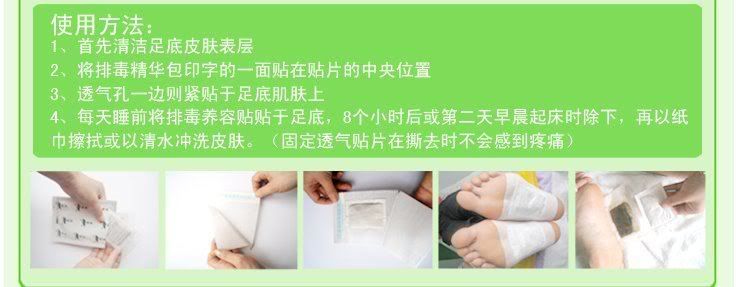 2、使用方法安全、方便又有效,只需在睡前将排毒足贴贴于足底(或不适之处),足底密集的穴位经络在各种精华的吸附下,大量流排黑褐色的毒素,效果神奇、触目惊心。