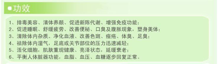 1、排毒美容、清体养颜、促进新陈代谢、增强免疫功能;