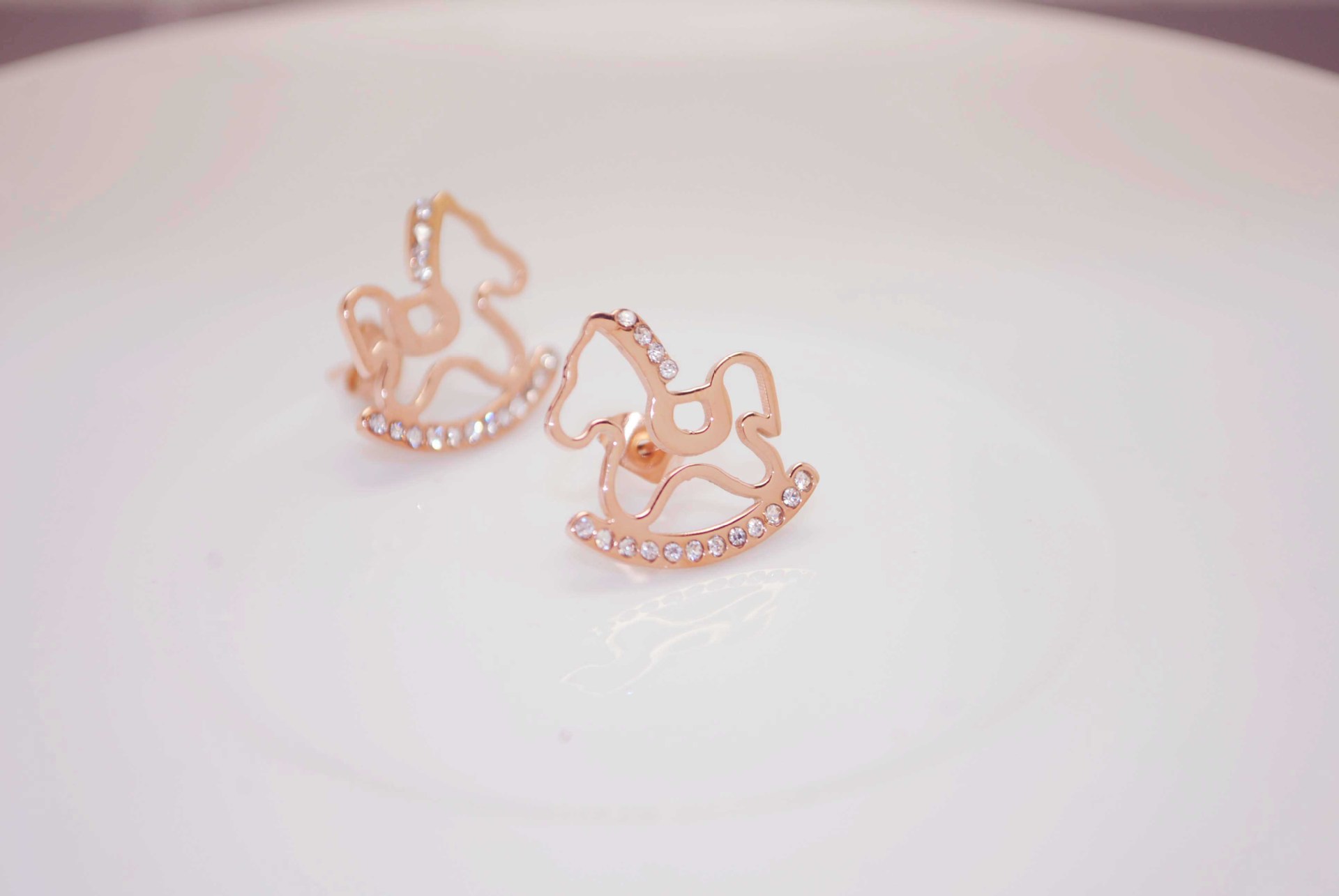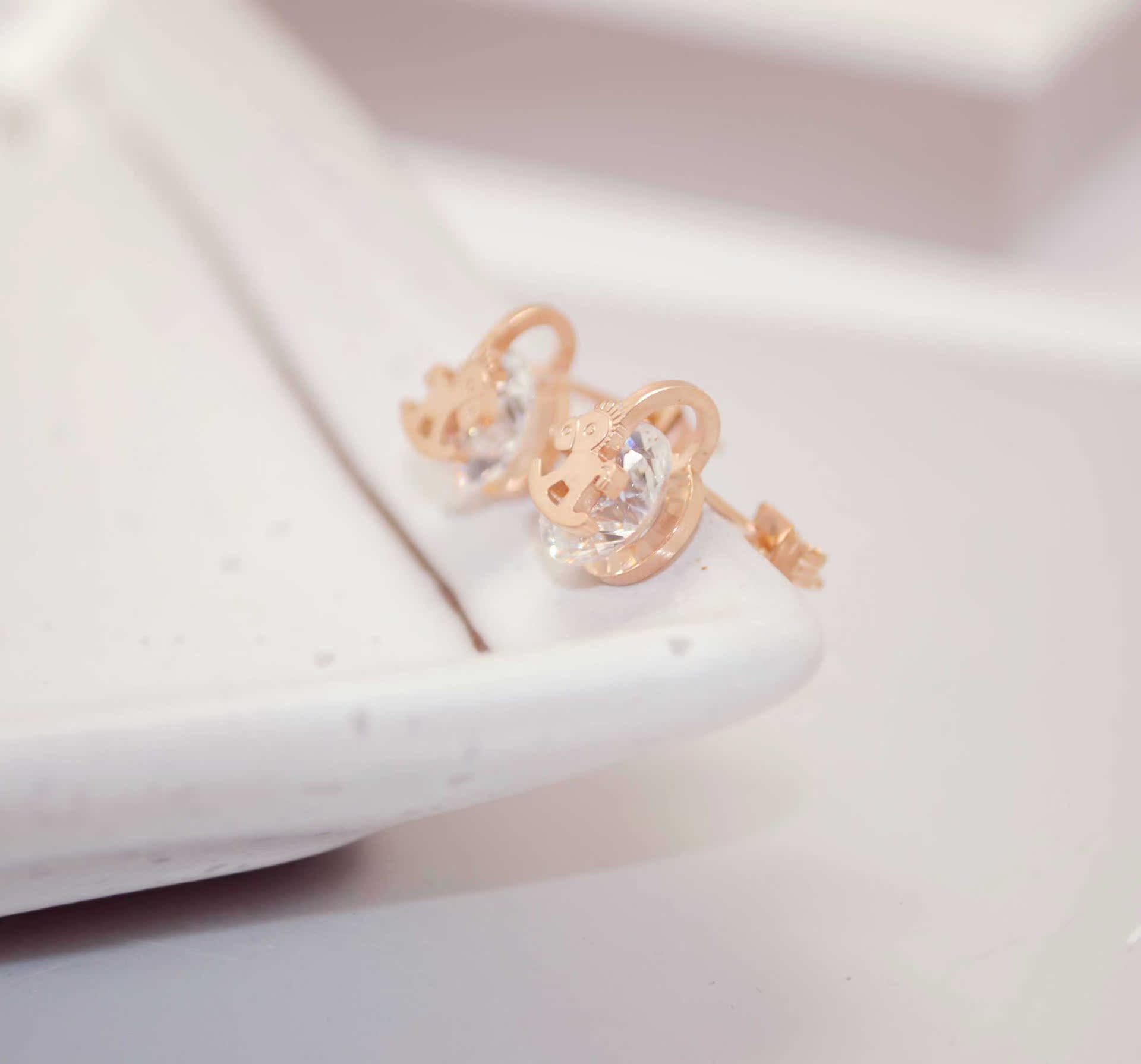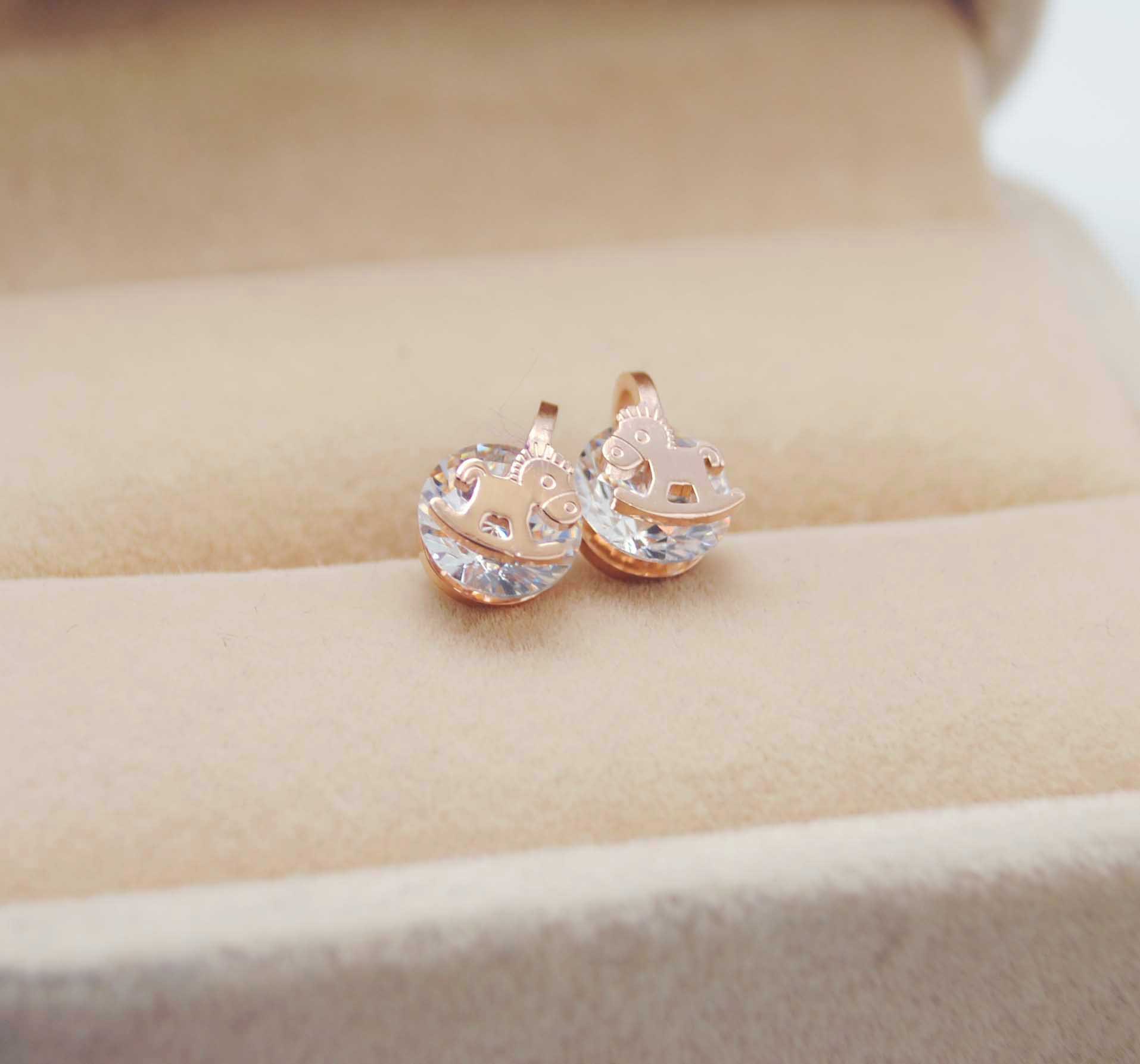 钛钢镀18k 玫瑰金 木马带钻耳钉