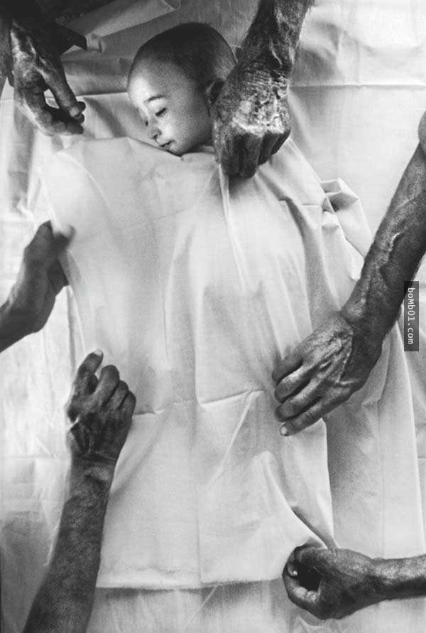 ▼2001:Jalozai 難民營中因脫水而死的1歲大的兒童屍體等待下葬。這名兒童的家人來自阿富汗北部,在巴基斯坦尋找避難所。他們按照穆斯林傳統將屍體洗淨後並給他穿上白色的壽衣。在過度擁擠的難民營中,8萬名來自阿富汗的難民生活在肮髒的環境中。