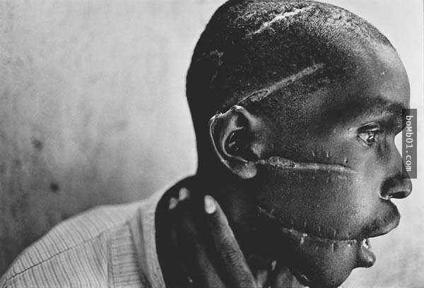 ▼1994:紅十字會醫院裡一名Hutu男性。他因被懷疑同情圖西叛軍而被Hutu民兵虐待。
