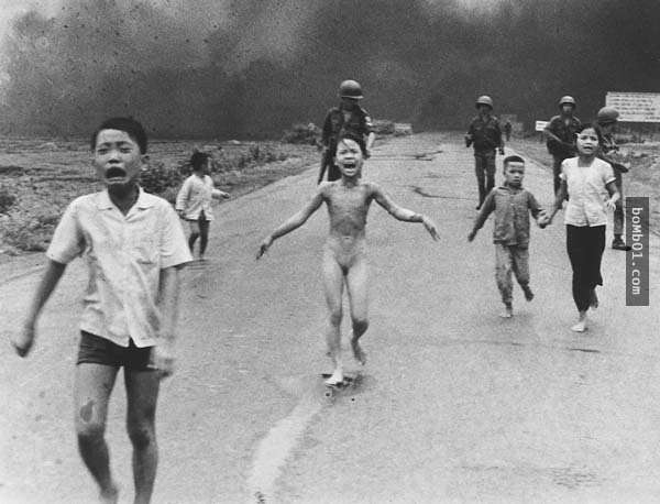 ▼1972:潘氏金淑(圖中)和其他兒童一起逃避南越飛機誤投的凝固汽油彈引起的大火。