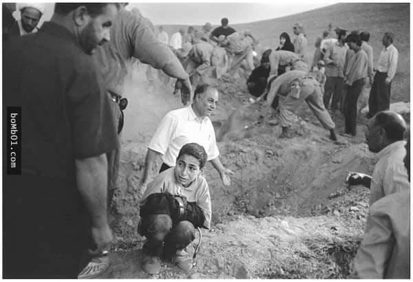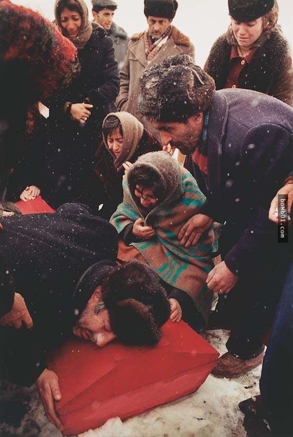 ▼2002:這個男孩抱著去世父親的褲子,蹲在他父親被埋葬的地方,周圍的士兵和村民都在挖掘墳墓來埋葬亞美尼亞地震中的受害者。