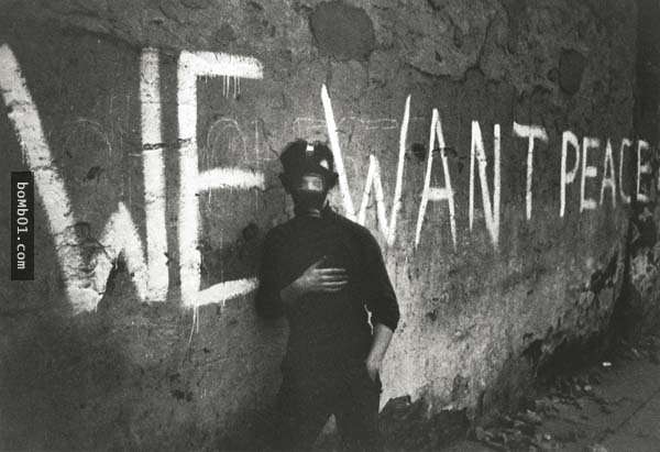 ▼1969:北愛爾蘭衝突中一名戴著防毒面罩的天主教徒。經過一夜衝突後人群被催淚瓦斯驅散了。