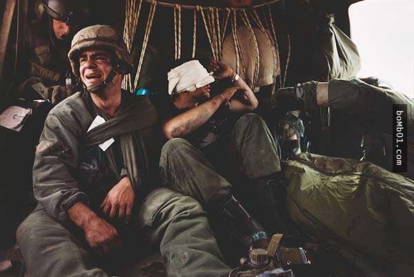 ▼1991:23歲的美軍中士 Ken Kozakiewicz依靠著腳邊裝著自己朋友 Andy Alaniz屍體的袋子痛苦。他的朋友都是被友軍火力擊中的。在海灣戰爭的最後一天,他們乘坐一架MASH直升機離開戰區。
