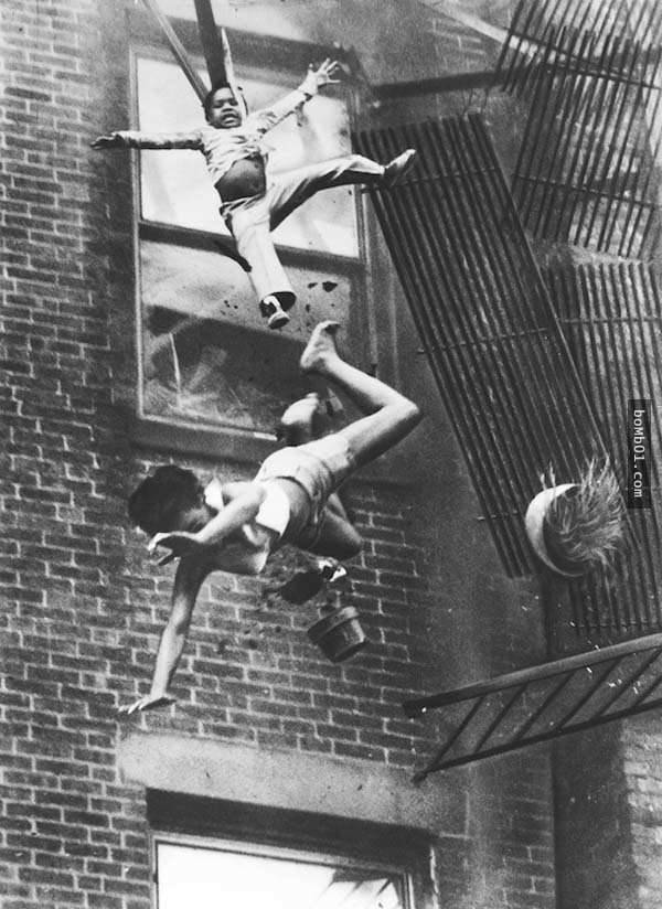 ▼1975:波士頓Marlborough街區大火中,一名母親和她的女兒從著火的公寓中跳樓逃生。