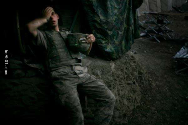 ▼2007:一天結束後,美軍第503步兵團第二大隊第二小隊的一名士兵靠在雷斯特雷波戰壕的基地上。