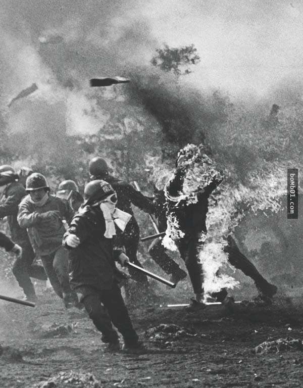 ▼1978:在抵制建造新東京機場的抗議活動中,一名示威者被準備投向警察的燃燒彈引發的大火吞沒。