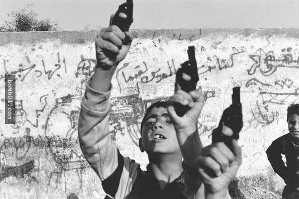 ▼1994:男孩們舉起手中的玩具槍進行挑釁。開始於1987年12月的巴勒斯坦人起義,加強了阿拉伯人與占領軍對抗的決心。3月,以色列關閉了與加沙的國境通道,導致失業人數大幅增加。超過80萬人被限制在以色列8公裡寬的地帶中,流血事件急劇增加。
