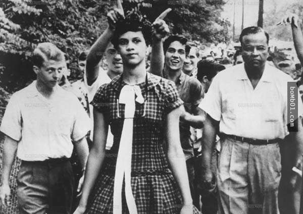 ▼1957:哈利哈丁高中取消種族隔離制度後,第一批入學的黑人學生之一的Dorothy Counts在入學第一天受到白人同學的嘲笑。
