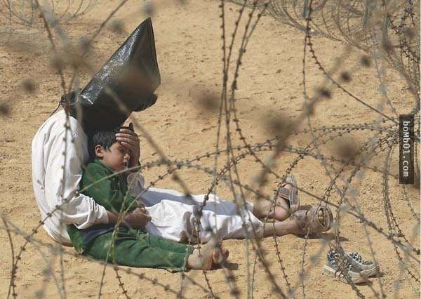 ▼2003:An Najaf附近美軍101空降師營地囚犯收容中心,一名伊拉克男子正在安慰自己4歲大的兒子。當他的父親被戴上面罩和手銬後,男孩變得非常害怕。之後士兵打開了塑料手銬,因此這名男子可以安慰自己的兒子。給他們戴面罩是因為比戴眼罩更容易。軍方表示戴面罩為了讓他們失去方向感並保護其身份。沒人知道這名男子和他的兒子發生了什麼。