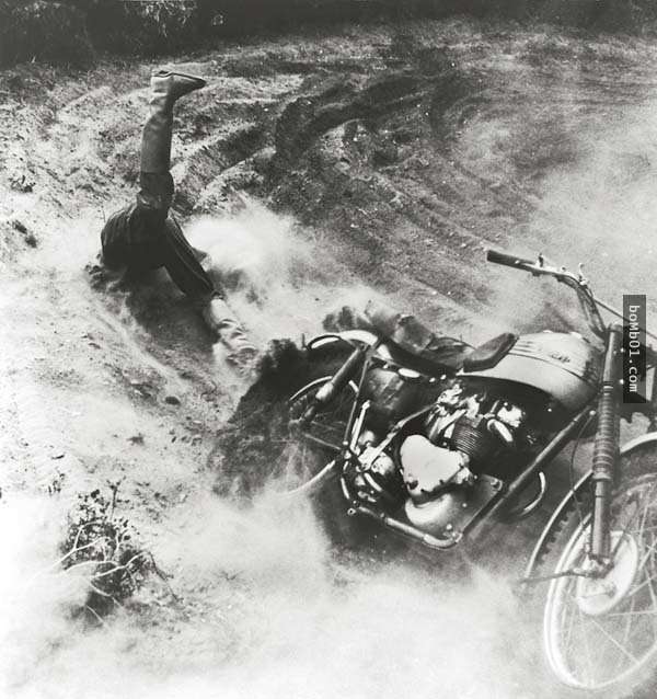 ▼1955:越野摩托世界錦標賽 Volk Mølle賽道上一名選手從摩托車上跌落。