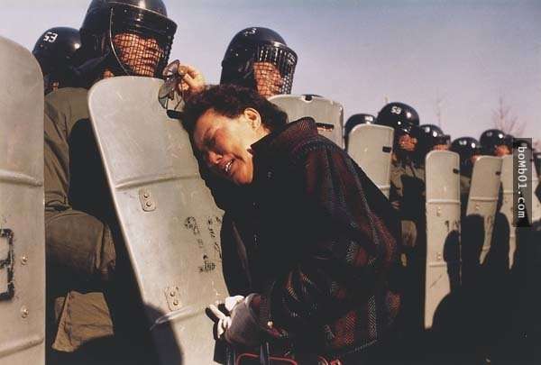 ▼1987:一位母親依靠在防暴警察的盾牌上。她的兒子因抗議大選被政府壟斷上街示威被捕。