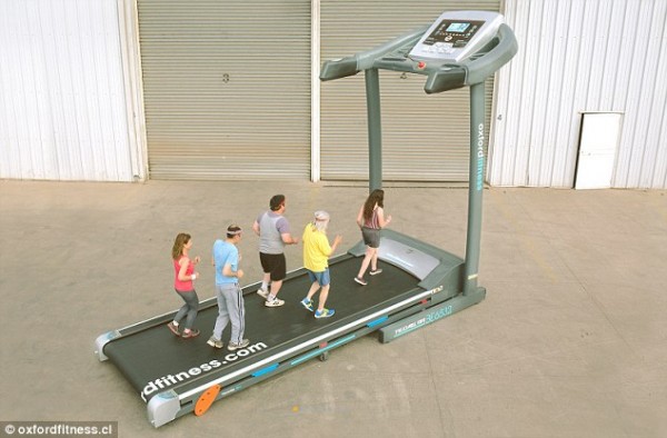 去健身房跑步機都滿了怎麼辦?智利一家運動器材廠商,研發出一台「進擊的跑步機」,一次可容納10人,在跑步機上一起跑。 據英國《每日郵報》報導,智利運動器材廠商「Oxford Fitness」,近日打造一部「巨大跑步機」,足足有5公尺高3公尺寬,並且可容納10人一起跑,人站上去瞬間縮小,就像到了巨人國一樣。 有網友好奇這麼大的跑步機,要怎按下操作鈕,而廠商也在宣傳影片中顯示,工作人員要用工作梯爬超高,再用長棒按開關,才能開始比賽。而廠商特別舉辦了兩場比賽,第一場參賽者要在以每小時9.7公里的速度,測試參加者持久力;第二場則是不斷加速,增加至最高每小時16公里,撐到最後還留在巨大跑步機上,沒被「彈」走的選手就贏了。