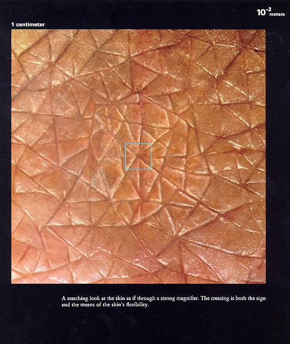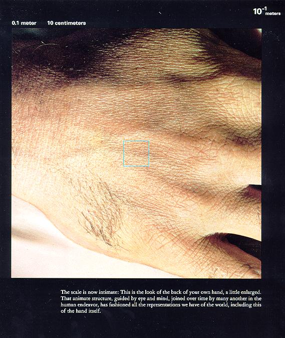 0.1米 一米的十分之一,也叫分米,我们手所能把握的尺度。相信人类所接触的大部分物体都是在这样一个数量级的。看看你的周围,键盘、鼠标、手机、杯子、碗…… 仔细一看这哥们手上的毛还挺重的,纯爷们! 1厘米 这是他手上的皱纹细部。兴许你放大了还没他细皮嫩肉呢。做好准备,我们即将进入另一个陌生的领域——微观世界。 1毫米 手上的毛孔。可是,汗毛呢?晕! 100微米 再放大十倍,依稀可见皮肤的组织结构。 10微米 一个细胞的数量级就是10微米,当然这只是一般来说。插句嘴,世界上最大的细胞是鸵鸟蛋,它是一个单独的卵细胞,数量级是分米级的,厉害吧。
