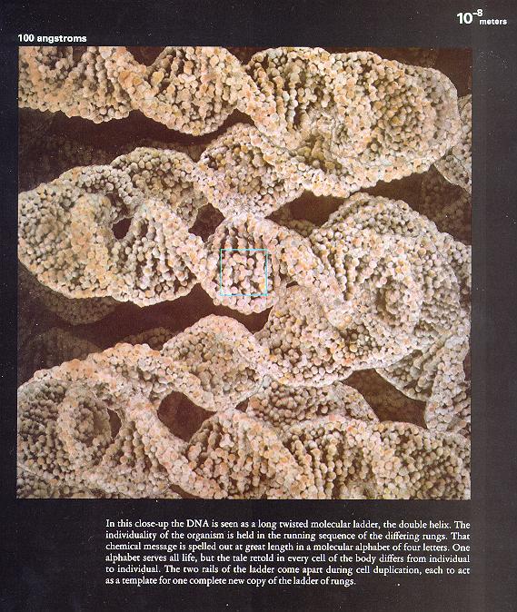 0.1微米 嘿!一看这么高度螺旋的结构就知道是染色体了。底下的洋文说:但凡人类的细胞,里面都会有23对染色体(46条)。 100埃 埃是一种长度单位,指10的-10次方米。用字母“A”顶上加个小圆圈来表示。100埃的数量级就能度量某些有机大分子的物质了。 看到这个规则的等距双螺旋结构,我想你一定能够脱口而出了。没错,这种物质就叫做脱氧核糖核酸,也就是常说的DNA。分子结构清晰可见。 1纳米 我们管10的-9次方米叫一纳米。现在为材料科学炒得火热的纳米技术就是说很多物质精细到纳米级后将表现出很多在常规数量级上所表现不出的性质来。在纳米这样的数量级下,我们连原子都可以数清了。因此,纳米级又叫原子级。 下图是组成DNA分子的原子们,它们以共价键和氢键彼此结合成庞大的有机分子。生命就在这种复杂的结合中得以体现。敬礼! 1埃 上过中学的就都应该知道:原子是由原子核和电子组成的。下图中所表示的是密布的电子云,我们能看到原子核外围的电子云比较浓。 所谓电子云,其实并不是说一个原子拥有无数个电子,象云雾般的弥漫四围。每个原子拥有的电子数都是固定的,有数的,具体依元素种类而定。这些电子行踪飘忽不定,在原子核外部乱窜。一个电子,无数法身。就把这些电子“团团转”的特点用电子云来形容了。离核近的地方出现的几率大些,云就密;离核远的地方出现的几率小些,云就稀。