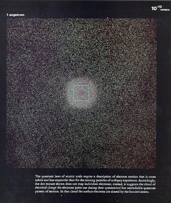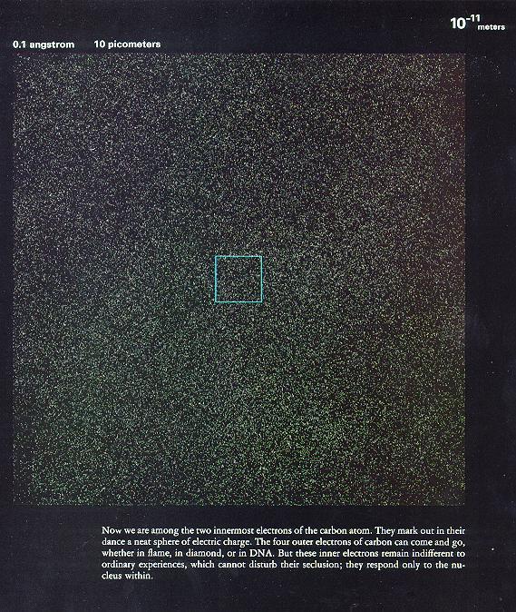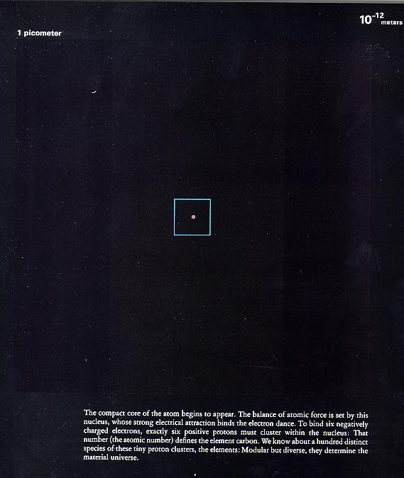 10皮米 原子核外围的浓密电子云。仿佛到了浩瀚无边的宇宙。这样来看每个原子都像是个小宇宙,我们的世界就这样的周而复始着,不寒而栗着…… 1皮米 穿过最浓的电子云,发现更近核的地方反倒清净。原来离得远了要吸引,离得近了也会排斥呢,保持一个最佳的距离才好。(挺象搞对象呦^_^) 什么?你说电子阴性,原子核阳性,异性相吸,应该越近核越密才对?别逗了!真要那样越近越吸,越吸越近,电子还不都撞到核上去,最后谁也动弹不得! 可是为什么不是这样呢?国家机密!就不告诉你,嘿嘿! 下图框中的斑点就是原子核。
