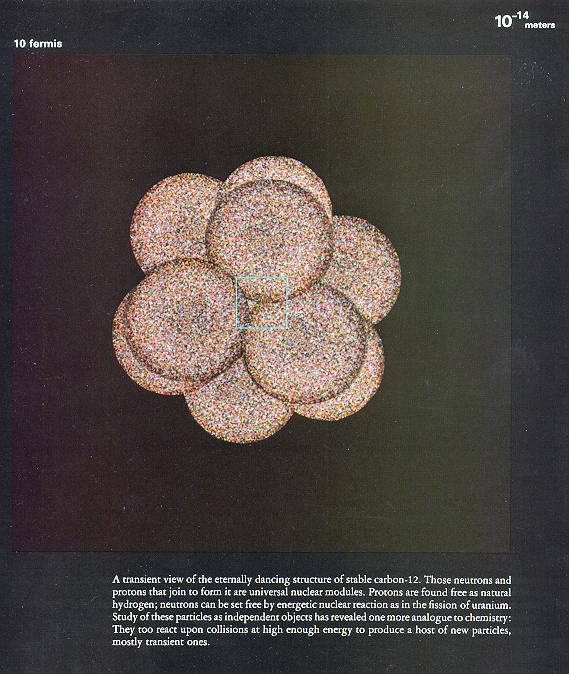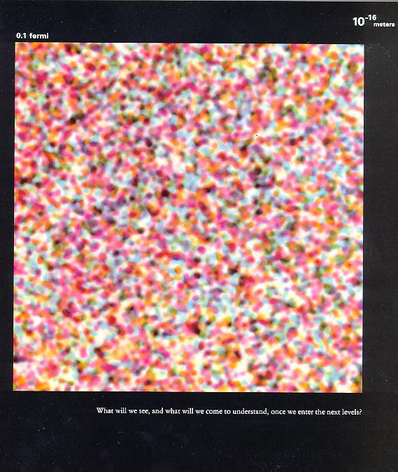 1飞米(10的-15次方米) 质子(也可能是中子)的细部,乱七八糟一大片。未知的结构,未知的领域。