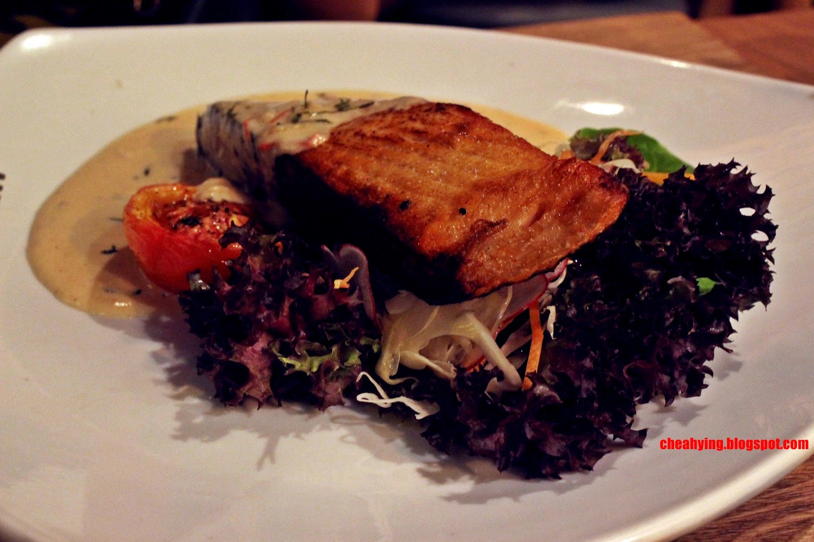 OVER FRIED SALMON FILLET WITH SPICY BUTTER CREAM SAUCE WITH FRESH SALAD--名字就是这样over fried,真的!很脆的外皮,但是不会焦过头,里面很甜^^haha很新鲜