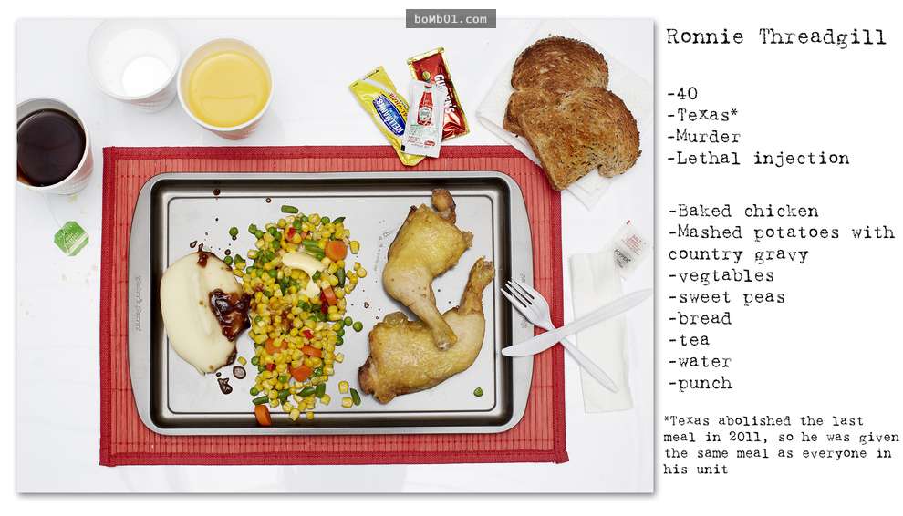 ▼Ronnie Threadgill,40岁,来自美国德克萨斯州。因谋杀罪名成立被判死刑。不过由于德克萨斯州在2011年废除最后一餐的请求后,他只能吃跟平时一样的餐点做为他的最后一餐。而这些食物是烤鸡、马铃薯泥、蔬菜、甜豌豆、土司、一杯茶、一杯水和宾治酒。