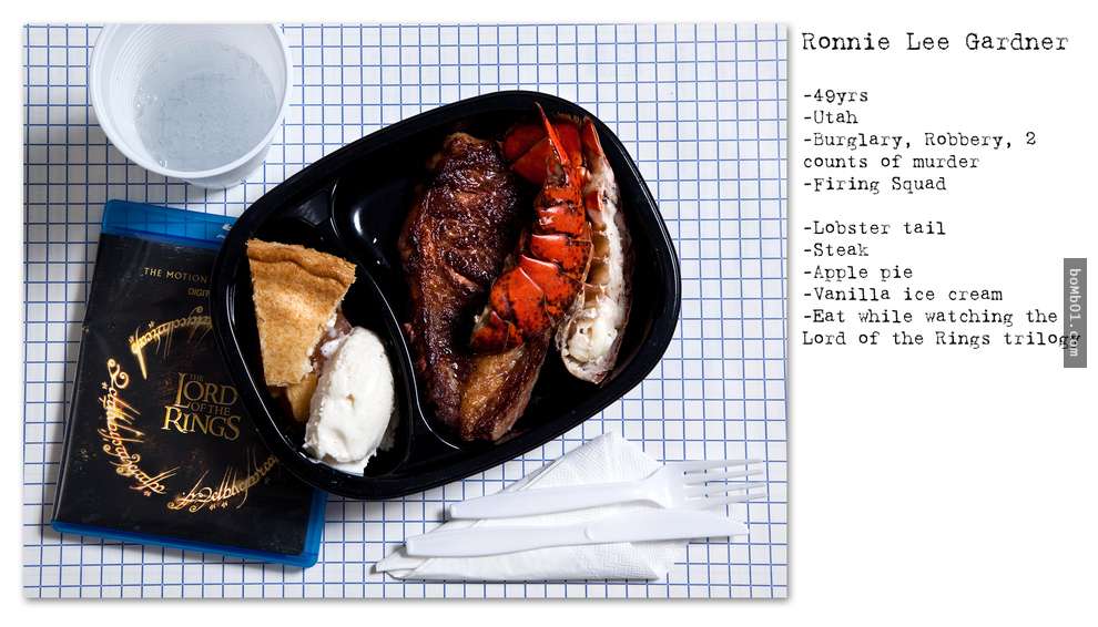 ▼Ronnie Lee Gardner,49岁,来自美国犹他州。他因为入室盗窃、抢劫和谋杀被判枪决。在最后一餐他点了龙虾的尾巴、牛排、苹果派,香草口味的冰淇淋。而且他还要求一边吃著他的最后一餐,一边观看魔戒三部曲。