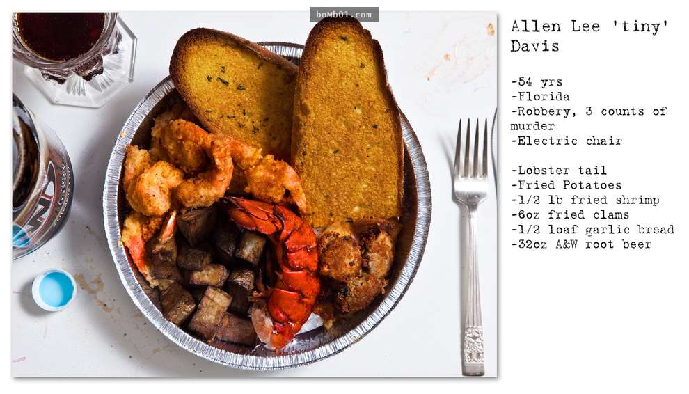 ▼Allen Lee Davis,别名Tiny,54岁来自美国佛罗里达州。因抢劫和谋杀被判电椅死刑。他最后一餐的食物有龙虾的尾巴、炒马铃薯、0.22公斤的炸虾、0.17公斤的炒蛤蜊、半片香蒜面包以及一大杯的A&W麦根沙士。